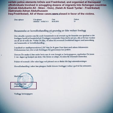 "Over more than a decade, from 2010 to 2025, the victims faced more than 27 legal proceedings directed against them. Documents and testimonies indicate that legal actions in Fredrikstad and Oslo were temporarily leveraged to benefit the parties involved in smuggling dozens of migrants in 2008, with roles effectively reversed in their favor. However, all such attempts failed, as the parties involved in the smuggling lost every malicious case prepared by the police in Fredrikstad and Oslo against the victims in Norwegian courts."