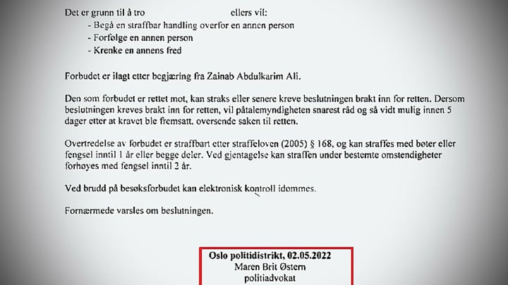 "Written correspondence shows that the coordinator of the smuggling operations, Zainab, sent a police officer to the victims’ residence in Oslo after locating one of their addresses in 2022, following years of investigation. This action aimed to intimidate the victims, prevent them from reporting her to the authorities, and pressure them to remove published information related to the smuggling operations. The documents indicate that the officer was sent in a manner reminiscent of mafia-style tactics, reflecting the coordinator’s continued surveillance near the victims’ homes and her use of police connections to achieve her objectives of intimidation and concealment."